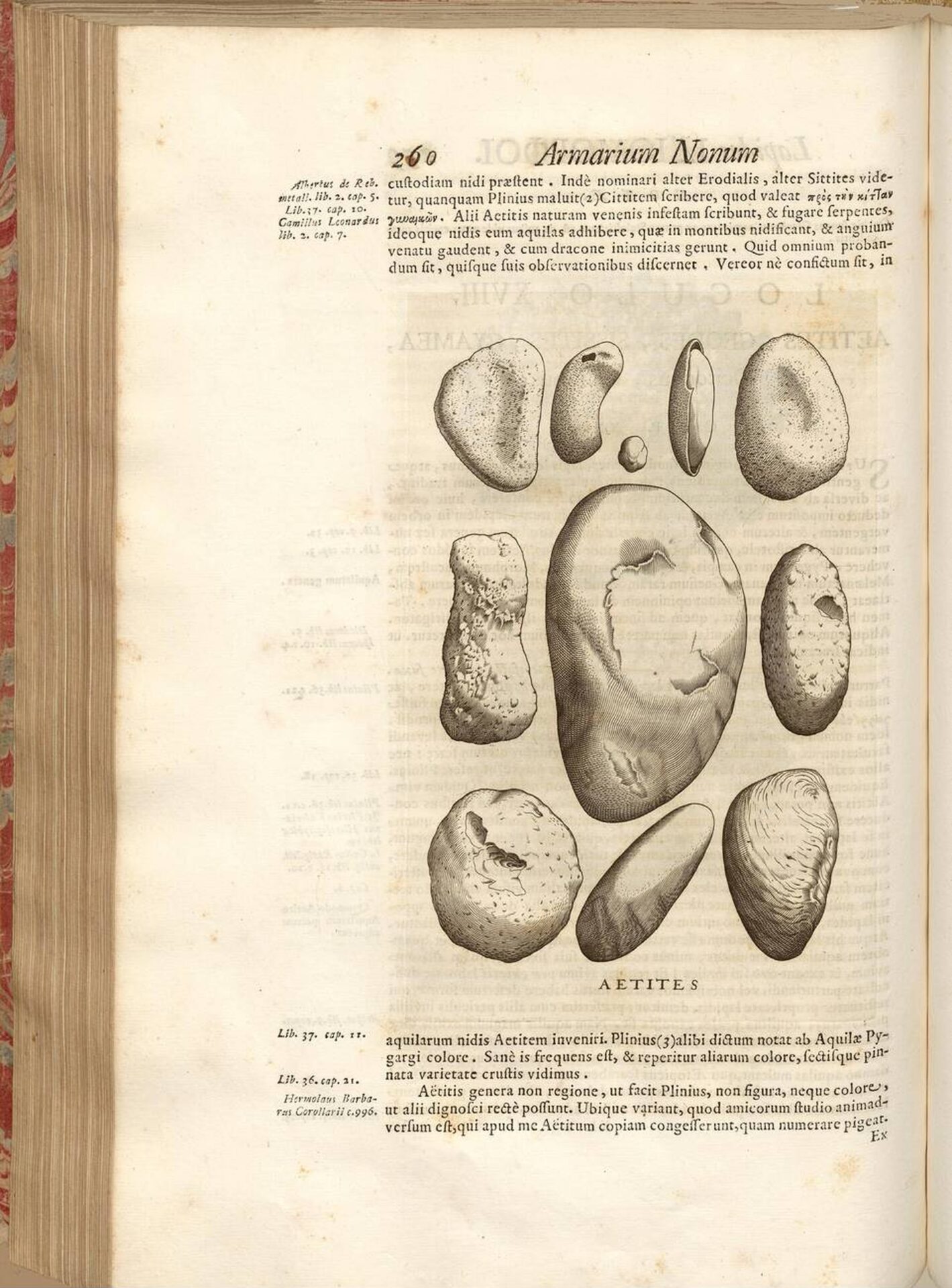in appearance; or else of a reddish hue, with a hard stone in the interior. The third kind is a stone found in the Isle of Cyprus, and resembles those of Africa in appearance, but is larger and flat, while the others are of a globular form: it contains a sand within of a pleasing colour, and mixed with small stones; being so soft itself as to admit of being crushed between the fingers. The fourth variety is known as the Taphiusian aetites, […] It is met with in the beds of rivers there, and is white and round […] none of the other varieties of Aetites have a smoother surface than this ‘.