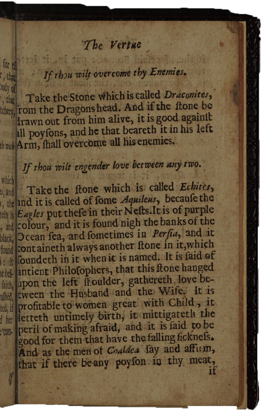 ‘Aetites, or the stone with child, because being hollow in the middle, it contains another little stone within it, it is found in an Eagles nest, and in many other places; this stone being bound to the left arm of women with child, staies their miscarriage or abortion, but when the time of their labor comes, remove it from their arm, and bind it to the inside of their thigh, and it brings forth the child, and that (almost) without any pain at all.’