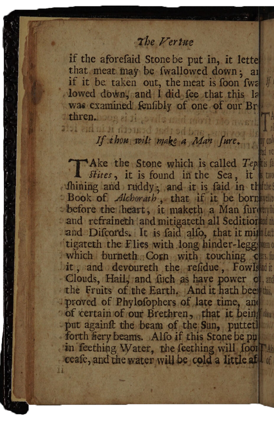 ‘And thus I end the Stones, the vertues of which if any think incredible, I answer, 1. I quoted the Authors where I had them, 2. I know nothing to the contrary but why it may be as possible as the sound of a Trumpet is to incite a man to valor, or of a Fiddle to dauncing; and if I have added a few Simples which the Colledg left out, I hope my fault is not much, or at least wise, venial.’