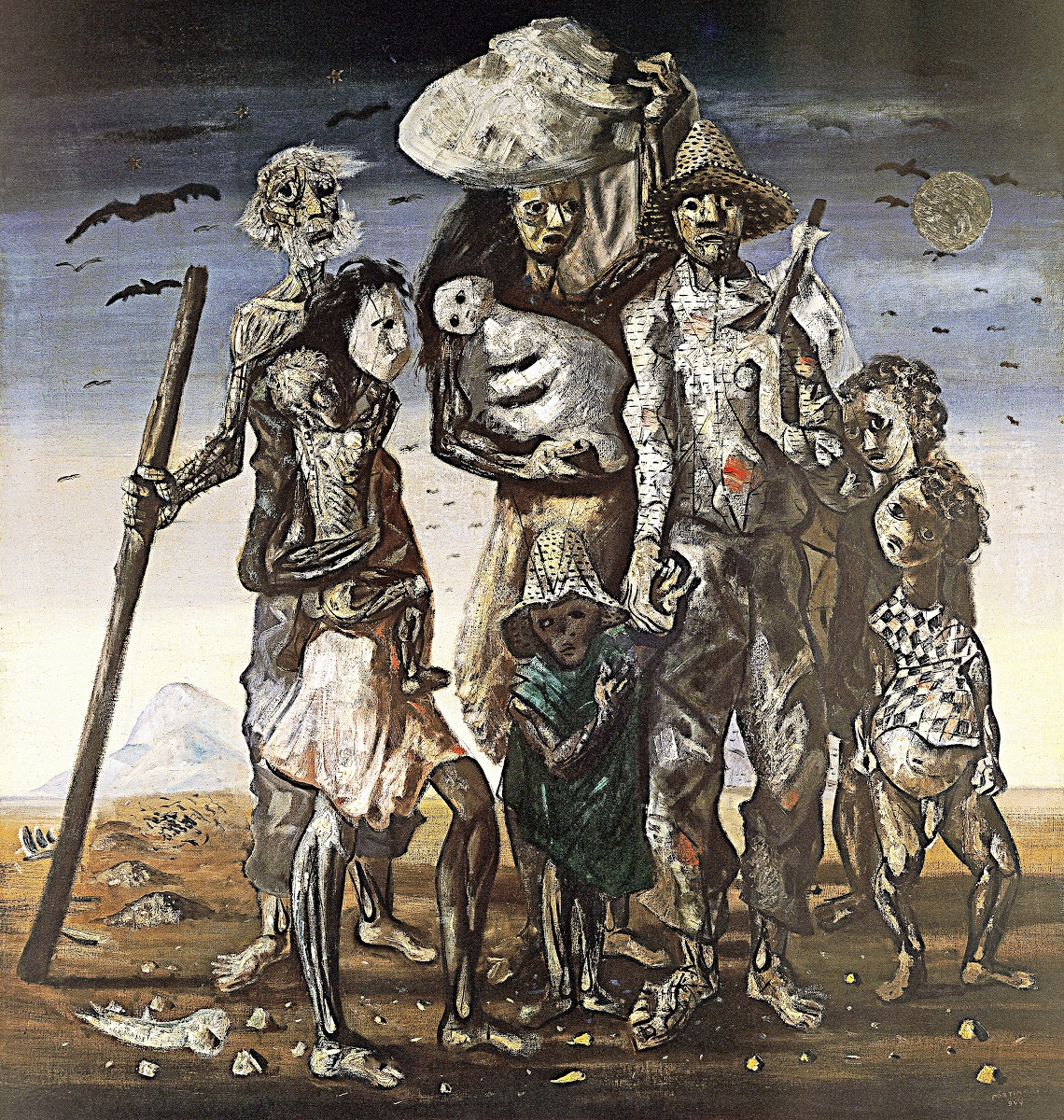 The atmosphere in Migrants is somber and heavy, with death looming in every corner. There are four adults and five children, standing against a lifeless, dry backdrop. Vultures circle overhead, bones litter the ground—it’s a scene of despair. The adults look straight at us, their expressions practically begging for help. The children, thin and ghost-like, are even harder to look at. One boy’s swollen belly isn’t from eating too much; it’s from schistosomiasis, a parasitic disease common in that region at the time. In Brazil, we call this distended abdomen “water belly”, and it’s an image often associated with poverty. It’s a heartbreaking detail that underscores the harsh realities these families faced.