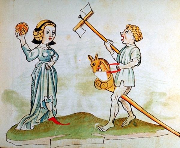 Games of action and skill were played by adult men, boys, youths, and sometimes even girls and women (the shock!). Ball games, for instance, involved using hands, feet, bats, or a combination of them and “stool-ball” involved defending a kind of wicket stool with a bat while another player tried to topple it, so, similar to cricket or baseball today. It was considered harmless enough for girls and women to play by themselves or with boys. Tennis was widespread and particularly popular at court, as a game where players hit a ball against a wall or the ground or over a net, using their hands or a racket. And although most ball games were played primarily by boys, girls sometimes joined in. As I’m sure you noticed, though, the primary sources used for this text focus mainly on boys, about whom there are more documents, such as exercise books used at grammar schools. Because people worried more about their education, their play was discussed at length, and so we know more about it. As it’s often the case, with girls and women we are largely left to imagine and fill in the gaps using educated guesses. For boys and men, though, it’s important to keep in mind how much overlap there was between playing games that required strength and developping athletic and military skills which could be useful, especially for those of wealthy families.