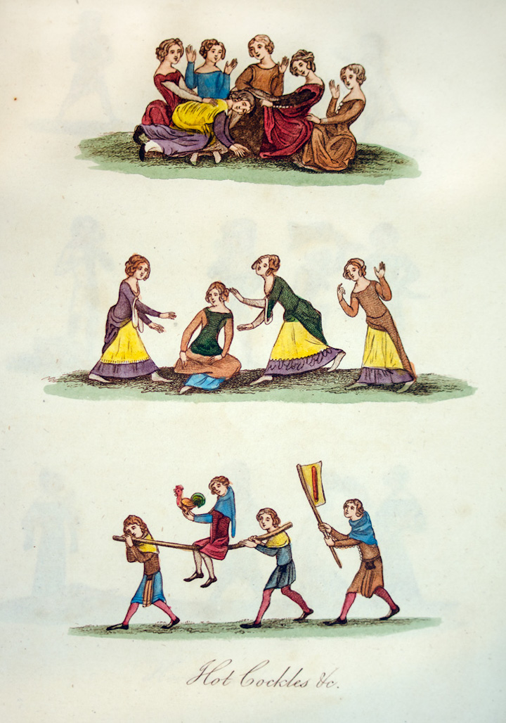 Some of them were also adult games. Many remained popular into the 19th century, and they were catalogued by the incredible folklorist Alice Bertha, Lady Gomme. Games were divided into those of skill (whether manual dexterity or intelligence) and those requiring physical strength. In the first category, there were actions using parts of the body, such as whistling, bird calls, popping noises, or finger tricks. “Handy-dandy”, for instance, involved moving small objects from hand to hand while someone guessed where they were. “Cherry-pits” or “cherry-stones” was more interactive and competitive. Children would throw cherry stones at a hole to score, and they would usually lose the stones that missed the target. Similarly, using nuts or conkers, children created miniature versions of bowls. The same could be done with marbles, which were often called ‘stones’, too.